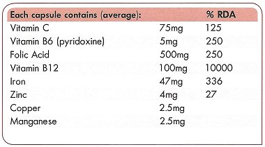 Συμβάλει στον εμπλουτισμό του αίματος με βιταμίνες, μέταλλα και θρεπτικά συστατικά, στις περιπτώσεις που ο οργανισμός δεν είναι σε θέση να τα προσλάβει ή να τα απορροφήσει από την διατροφή και έτσι εμπλουτίζεται η δημιουργία υγιών ερυθρών αιμοσφαιρίων. Οι κάψουλες είναι ειδικά σχεδιασμένες να βοηθήσουν στην ασφαλή διατροφική πρόσληψη της βιταμίνης Β12, του Φολικού οξέως, του Ψευδαργύρου, του σιδήρου και της βιταμίνης C, βοηθώντας έτσι στην διατήρηση ενός υγιούς κυκλοφορικού συστήματος που είναι απαραίτητα για καθημερινή ζωντάνια του σώματος.